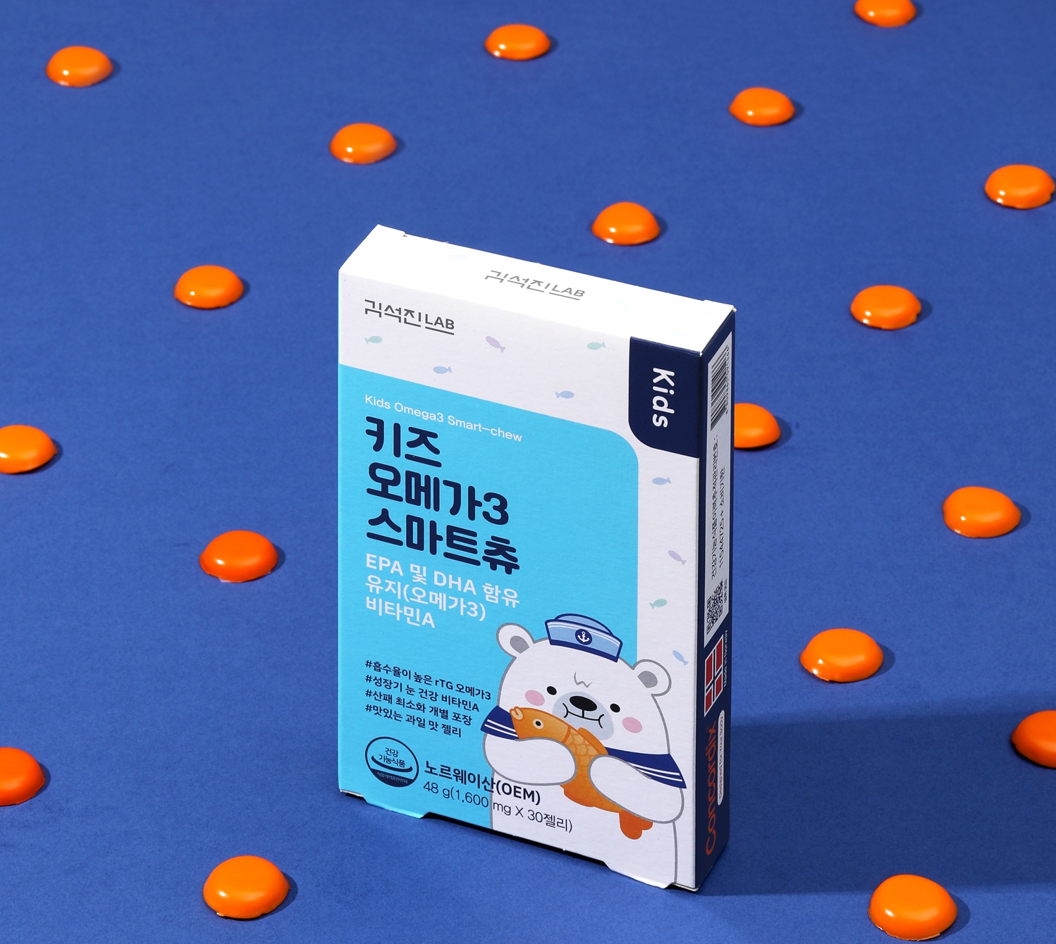김석진LAB(랩) ‘키즈 오메가3 스마트츄’는 청정지역 노르웨이에서 직수입한 제품으로, EPA 및 DHA를 합쳐 502mg을 함유해 어린이의 혈중 중성지질 개선 및 혈행개선에 도움을 줄 수 있다. 또한 비타민A (300 ㎍ RAE)도 함께 담아 눈 건강까지 함께 챙길 수 있다.